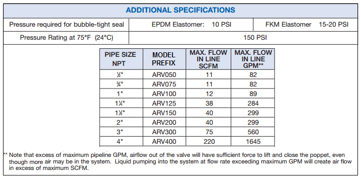 Series ARV is a normally-open valve. Until your system is pressurized, the valve is simply open, and air is present. As pressure builds within the system, unwanted air is forced to the highest point in the system, i.e., the normally-open Air Release Valve. When pressure within the system exceeds atmospheric pressure, air is expelled. As liquid rises, the poppet becomes buoyant and eventually closes. (Note minimum specific gravity of liquid must be .9 or higher). It is possible that trace amounts of air will remain in the system, depending on the rapidity with which the valve closes. It is also likely that some trace amounts of process liquid will be emitted. At system pressure of 10 psi (with EPDM elastomer), the poppet will seal bubble tight against the orifice. When pressure and liquid level drop, the valve will automatically re-open.1