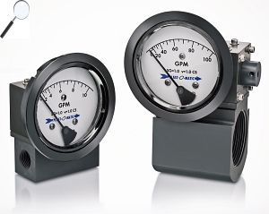 This design features a spring-loaded diaphragm and magnetic movement to measure the pressure drop across a fixed orifice. Flow rate is proportional to the square root of the resulting differential, and directly displayed on the dial as gallons per minute. The magnetic movement is isolated from the liquid, with no linkages or other mechanical parts prone to variations or failure. Overall accuracy is ±2% full scale ascending, with repeatability at ±1%. These gauges feature a 5:1 turndown ratio; dial starting mark is 20% of full scale. Maximum pressure rating is 100 PSI. Connections are FNPT. For other options, please contact factory.