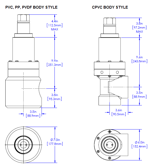 Photo immediately at right depicts CPVC models, and other body material designs prior to 2007. Internal design and performance properties are identical; the two versions differ in external appearance and minor external dimensions only.