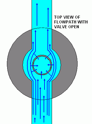 Above, liquid pressure in the line is below the set pressure. The spring holds the primary seal tightly against the orifice at the top of the relief port. Liquid flows straight through the valve, "around" the closed relief port.